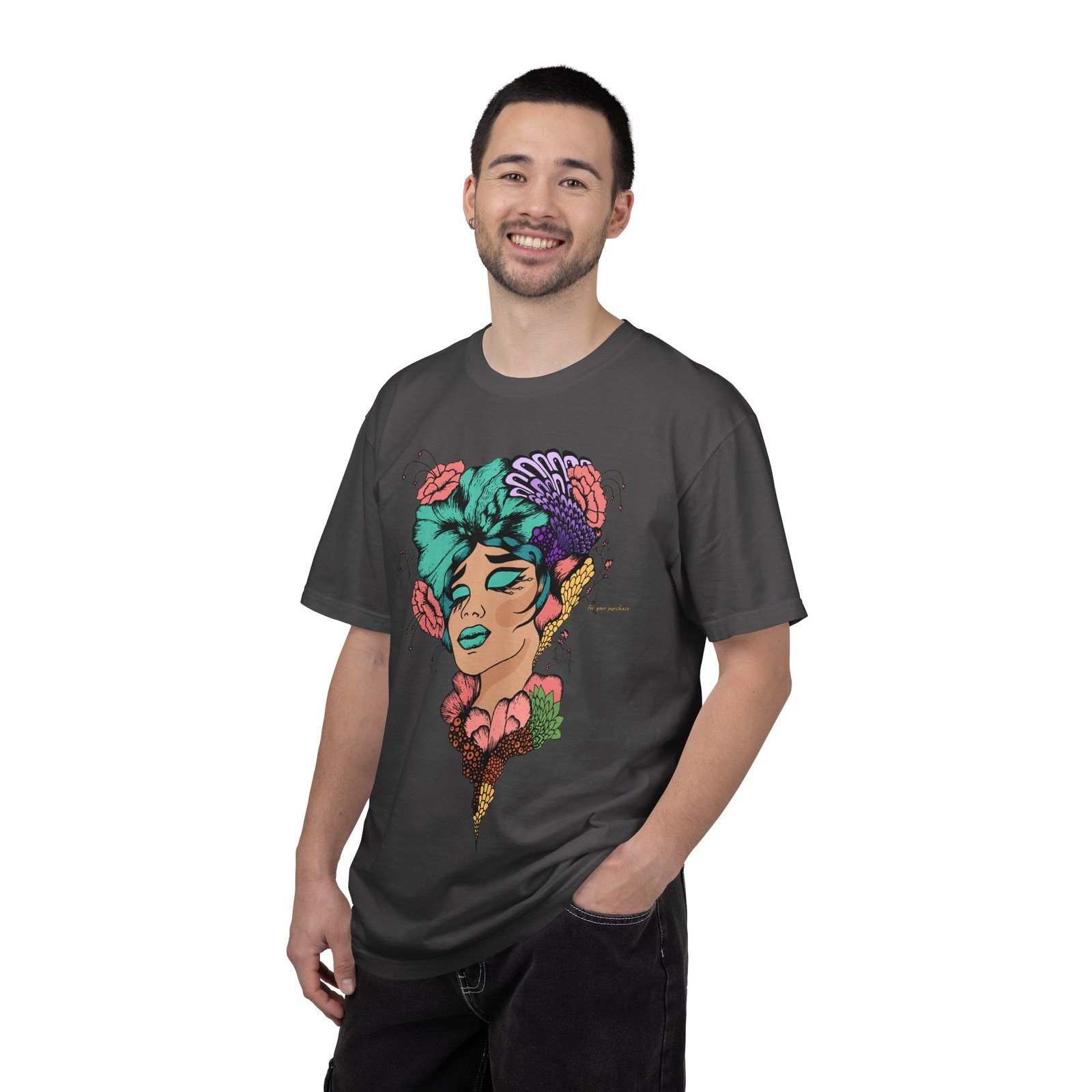 This relaxed-fit garment-dyed tee carries a bold, hand-illustrated portrait that blends floral motifs and surreal, tattoo-style linework. The heavy-weight 100% ring-spun cotton softens with wear and dye, so the printed artwork sits on a lived-in canvas that ages beautifully. Wear it to add a splash of color and attitude to street-style looks, gallery nights, or long coffee-shop afternoons. The roomy cut and pre-shrunk fabric make it comfortable all day, while double-needle stitching and tubular construction keep the shape through repeated wear. Choose from an array of colors to contrast or complement the vivid greens, pinks, and teal tones in the design.